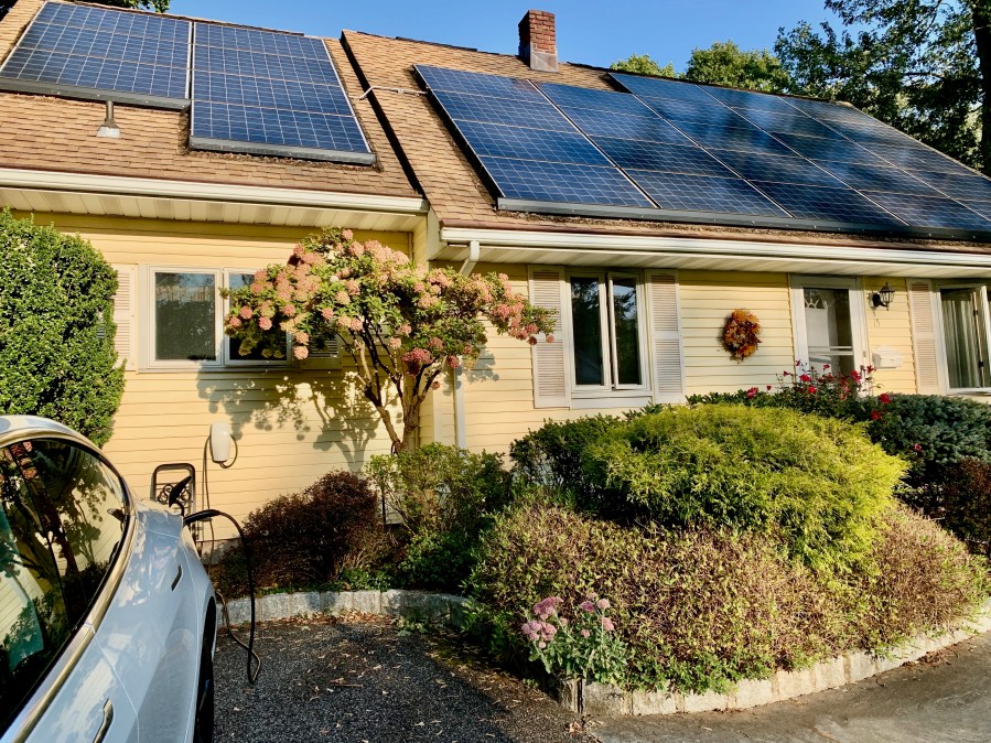 Solar panels and electric vehicle, New York, USA